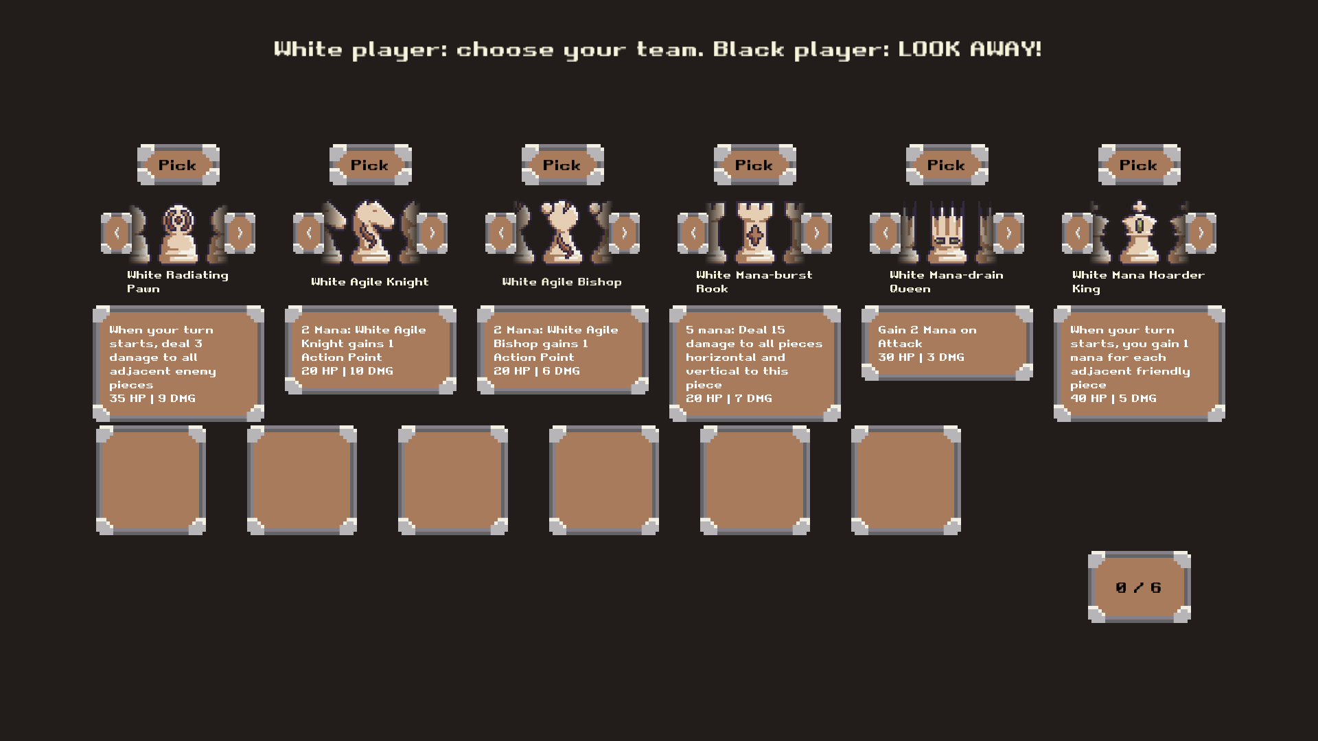 Each player controls 6 units of varying health, damage, and special abilities, with the goal of destroying all the opponent's units.